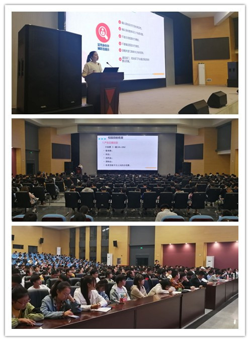 大会开始,侯聪老师提出两种常见的网络骗局:校园贷和电信诈骗,并结合自身经历做出具体阐述。