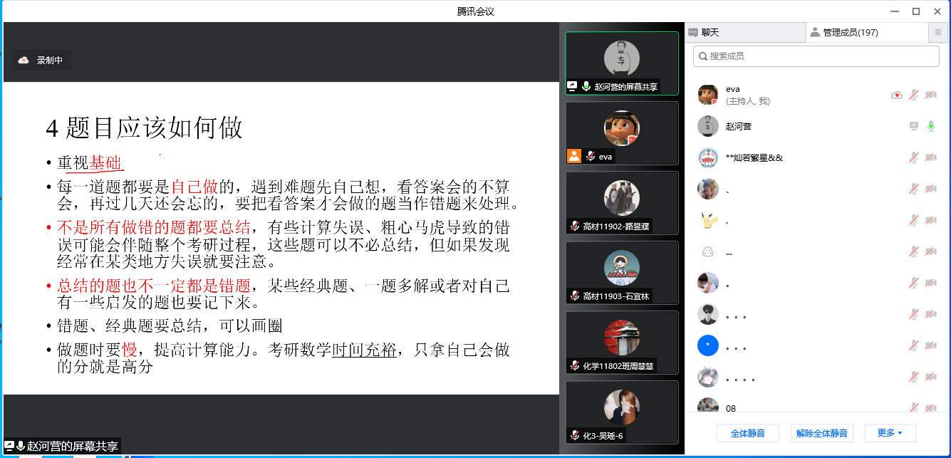 会议初始,负责公司研究生招生的石东坡教授给同学们分析了疫情之下严峻的考研形式,同时解读了公司考研的相关政策,欢迎同学们报考长大研究生。接下来,今年成功录取本校研究生的钟建铭同学分享了自己的所感所想,他结合自身情况给大家分析了为什么要考研、为什么选择报考bevictor伟德体育以及怎样备考等内容。