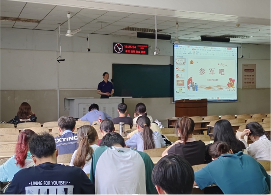 5月18日下午,bevictor伟德体育在12教202开展2023年秋季征兵宣讲活动,全院员工通过线下或线上方式参加会议。