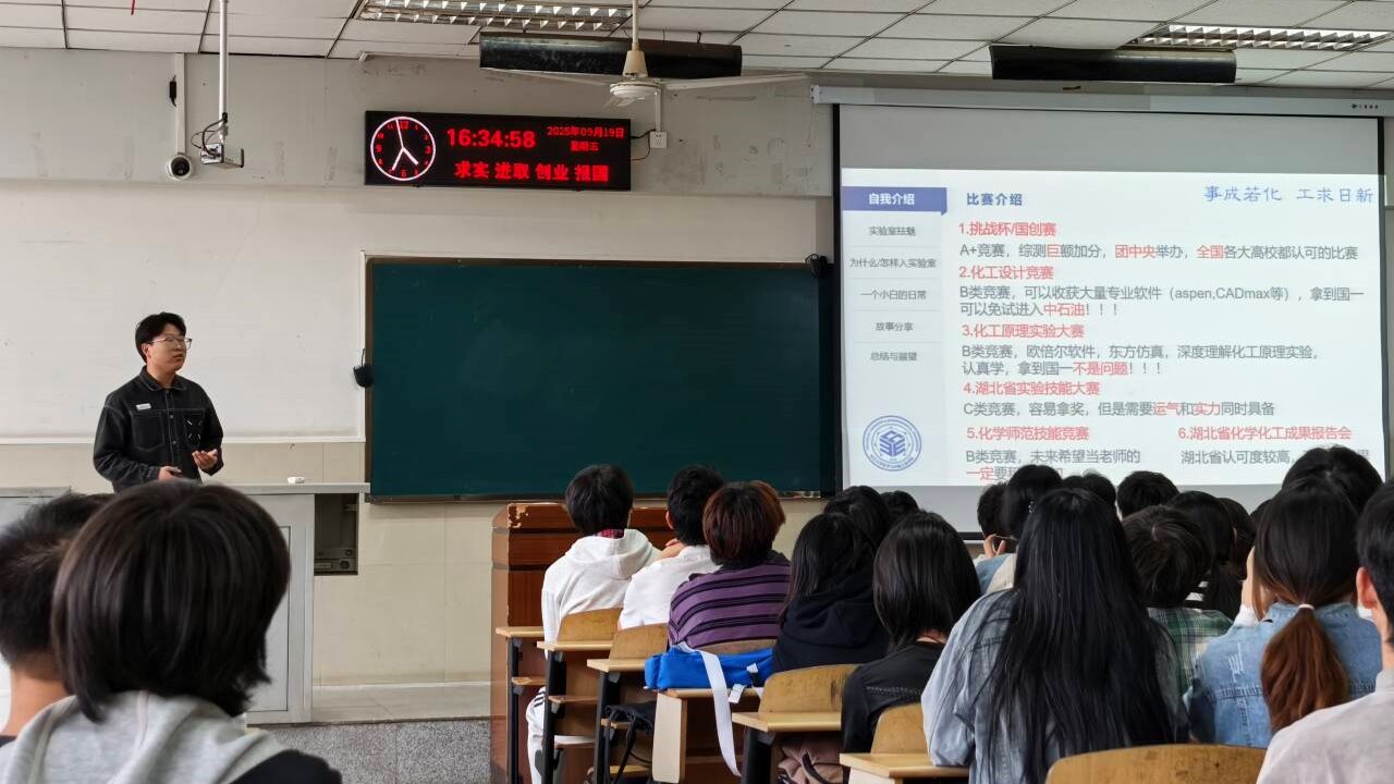 优秀员工代表白建设同学分享了科研成长历程。他以"从实验室小白到竞赛能手"为主题,详细介绍了通过文献检索训练、实验技能打磨等途径,在"挑战杯"、全国老员工化工设计竞赛中斩获佳绩的经验,鼓励同学们主动把握科研实践机会。