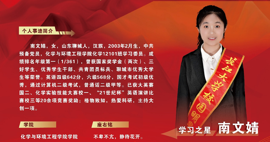大学是一个自我沉淀修炼、厚积薄发的地方。南文婧始终坚持以学为主,全面发展。本科三年,她认真学习化学相关理论知识及专业技能,并取得了较好的成绩。成绩排名年级第一,多门专业课成绩优异。