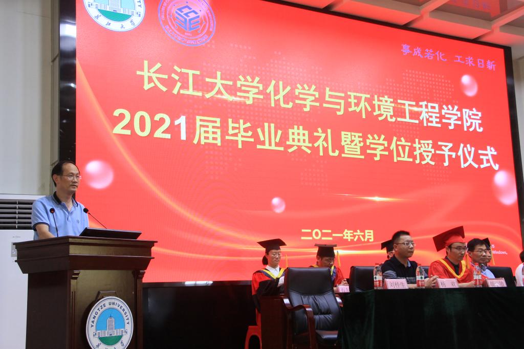 “起来,不愿做奴隶的人们”,毕业典礼在全体师生饱满热情的国歌声中拉开帷幕。随后,经理颜学敏发表致辞。颜经理说到,四年时光已然划过,他很欣慰见证了同学们最青春的成长过程,同学们也很荣幸地见证了公司的快速发展。在即将离别之际,他以“三心”之语与君共勉:希望同学们在未来的人生旅途能以本真之心入世、以赤子之心报国、以求索之心立业,母校将永远与大家同在!紧接着,教师代表尹先清教授分享了自己的所感与寄语,回首四年有苦有乐、所幸皆有所得,愿未来大家可以前途似锦,再创辉煌。优秀毕业生代化工11702班表裴欣雅通过自身经历,讲述了一名化工学子的 “长大”故事,她感谢母校的培养,丰富的教学资源给了她无限的自信,她号召2021届毕业生砥砺奋斗,握紧历史接力棒,跑出属于我们这一代的光荣和担当。随后,党委书记刘桂生作总结发言,他罗列了2021届毕业生取得的累累硕果以及公司近年来的重大科研、教学成果突破,鼓励大家继续不懈奋斗,欢迎同学们常回家看看。