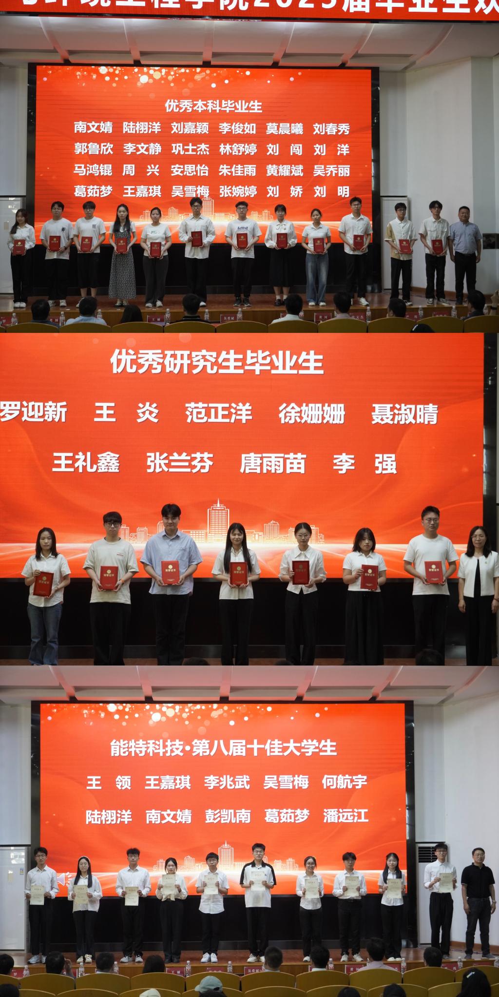 大会在热烈的氛围中拉开帷幕。主持人21级辅导员王娜以真挚的话语,向圆满完成学业的毕业生送上“毕业快乐”的美好祝福,现场掌声雷动。表彰环节中,公司对在学业、科研、实践等领域表现优异的个人与集体进行了表彰。2025届毕业生以笔为刃、以梦为马,共有136名本科生、8名研究生成功考入清华大学、南京大学等高等学府继续深造读硕读博,吴雪梅等21位同学作为考研优秀个人上台领奖;高材12102、化工12101等6个班级以及23栋A404等3个寝室,以卓越的团队协作精神脱颖而出,荣获考研先进班集体和考研优秀寝室荣誉称号;邓智豪、焦珂宣等19位员工,代表2025届57名优秀毕业生上台领奖,他们在校期间努力学习,全面发展,以青春之笔,书写了拼搏奋进的壮丽篇章;最后压轴登台的是荣获bevictor伟德体育“能特科技·第八届十佳老员工”称号的10位同学,能特科技董事长张光忠先生亲自为他们颁奖。每一个奖项的宣读,都伴随着热烈的掌声与欢呼声,彰显着化工学子的风采与荣耀。