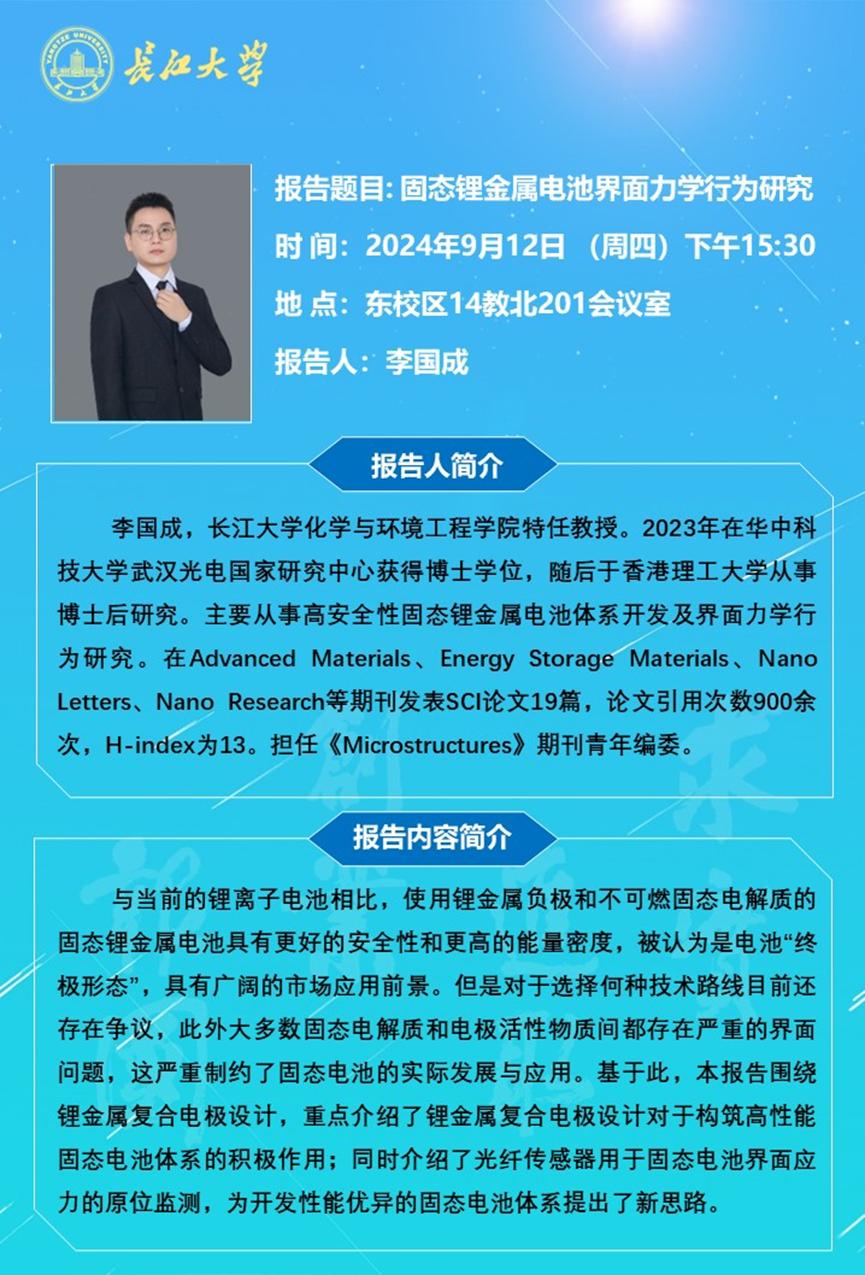 长江化工讲坛:固态锂金属电池界面力学行为研究