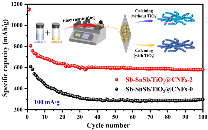 近日,《胶体与界面科学》(J Colloid Inte Sci)发表了bevictor伟德体育肖围教授课题组的最新研究成果,报道了静电纺丝法制备Sn/C纤维复合负极材料的新策略。该研究采用静电纺丝技术结合热处理工艺,利用TiO2纳米颗粒精心构筑了完整的纳米纤维网络结构,成功将SnSb合金颗粒均匀封装在导电互连的碳纳米纤维(CNFs)中,获得了电化学性能优异的锂离子电池复合负极材料。
