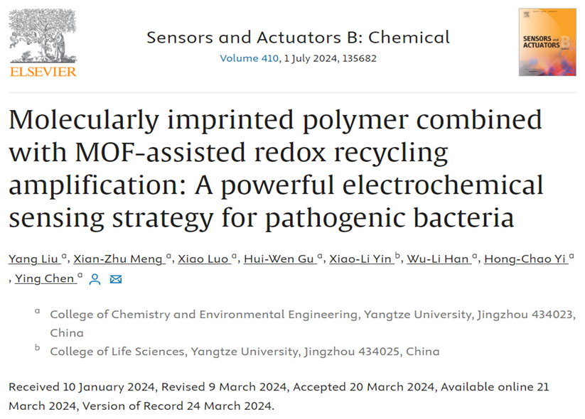 近日,bevictor伟德体育陈颖教授课题组在食源性致病菌的检测方面取得重要研究进展,相关研究成果以题为“Molecularly imprinted polymer combined with MOF-assisted redox recycling amplification: A powerful electrochemical sensing strategy for pathogenic bacteria”的学术论文发表于分析化学领域国际著名期刊《Sensors and Actuators B: Chemical》(IF=8.4,中科院一区Top期刊)上。硕士研究生刘洋为论文第一作者,陈颖教授为论文通讯作者。该研究受国家自然科学基金(21605007)和湖北省自然科学基金(2023AFB906)项目的资助。