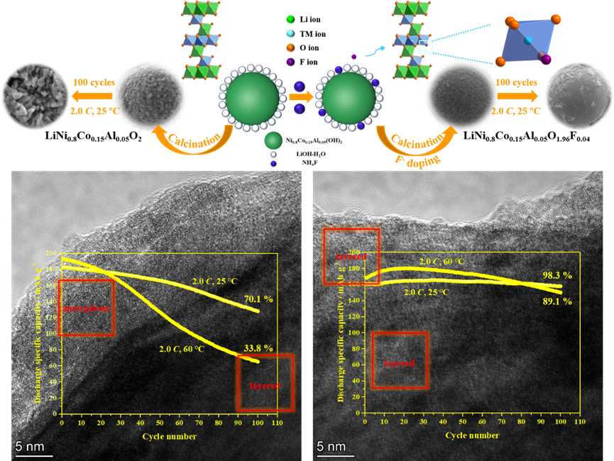 层状富镍氧化物一直被认为是高能量密度锂离子电池极最具发展前景的正极材料。但由于循环寿命短、热稳定性差等问题,一直面临着技术瓶颈。离子掺杂被认为是一种最常见的改性策略,通过在晶格中引入阳离子或阴离子,可以提高NCA材料的循环性能,其操作简单,效果显著。其中,阴离子掺杂可避免活性电化学过渡金属离子的额外消耗,从而保证了NCA材料的放电比容量。