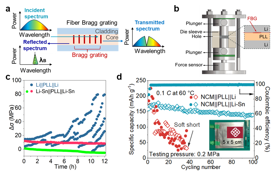 近日,bevictor伟德体育李国成博士在材料科学领域取得重要研究进展,其成果" Decoding Chemo-Mechanical Failure Mechanisms of Solid-State Lithium Metal Battery Under Low Stack Pressure via Optical Fiber Sensors "发表于国际顶级学术期刊《Advanced Materials》(IF=27.4,Nature Index收录期刊,中科院一区TOP)。该研究创新性地采用布拉格光纤光栅(FBG)传感技术,首次实现全固态锂金属对称电池界面应力场分布的原位动态监测,成功解耦了低轴向压力工况下化学-机械多场耦合作用诱发的电池失效机制。此项工作开创了固态电池界面力学行为原位表征新范式,为高精度光学传感技术在新型储能器件失效分析中的工程化应用开辟了创新路径。李国成博士为论文第一作者,bevictor伟德体育为论文通讯单位之一。 内容简述: 基于陶瓷-聚合物复合固态电解质的全固态锂金属电池展现出优异的储能应用前景,但其仍面临界面恶化与锂枝晶渗透等关键挑战,上述问题在低轴向压力工况下尤为严重。揭示其化学-机械耦合失效机理具有重大科学价值。本研究通过嵌入式光纤传感技术实时监测界面应力的演变与分布特征,阐明了其化学-力学耦合演化规律。研究发现,锂金属电极的不均匀溶出/沉积行为会引发界面应力的快速累积与空间异质性增长,进而加剧界面接触失效并诱发锂枝晶成核,引起电池短路失效。基于此,本工作构筑了三维锂/锂锡合金复合负极,发现该结构在低轴向压力条件下仍维持均匀的应力分布特征,实现了电化学性能的显著提升。本工作不仅构建了界面应力均匀性的原位定量表征方法体系,更为揭示全固态电池化学-力学失效机制提供了理论支撑,对高安全性固态电池体系开发具有指导意义。 该研究工作得到了香港理工大学深空探测研究项目(1-BBDC)、国家自然科学基金(52207230 和 92372109)、广州-香港联合基金项目(2023A03J0003 和2023A03J0103))等项目的支持。 图文摘要: 图(a)光纤光栅传感器工作原理示意图;(b)带有植入式光纤光栅传感器和外部压力传感器的改进型Swagelok电池示意图; (c)纯Li和Li-Sn固态对称电池前三次循环过程中的应力-时间曲线图;(d)固态软包电池的循环性能对比图。 文章链接:https://advanced.onlinelibrary.wiley.com/doi/full/10.1002/adma.202417770