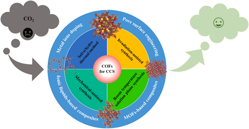 人为二氧化碳(CO₂)排放对环境和公众健康构成重大威胁。随着多种捕获技术(如固体吸附剂、溶剂法捕集和膜分离技术)的持续进步,二氧化碳捕获与封存(CCS)技术也取得了同步发展。吸附系统的实用价值取决于多重因素,包括高选择性、能源效率、可扩展性和可重复利用性。共价有机框架(COFs)材料作为一类极具前景的多孔吸附剂,已在CCS领域崭露头角。通过两种主要途径可显著增强COFs的功能特性:一是与金属有机框架(MOFs)或离子液体构建复合材料;二是采用孔表面工程、金属离子掺杂等修饰策略。本文基于分配系数和吸附容量指标,系统评估了这些改性方案在CCS应用中的可行性。同时探讨了CO₂捕获后COFs材料的再生机制,以推动其实际应用进程。最后,针对当前技术瓶颈和未来研究方向进行概述,旨在提升COFs基材料在真实工况下的规模化应用潜力与综合性能。